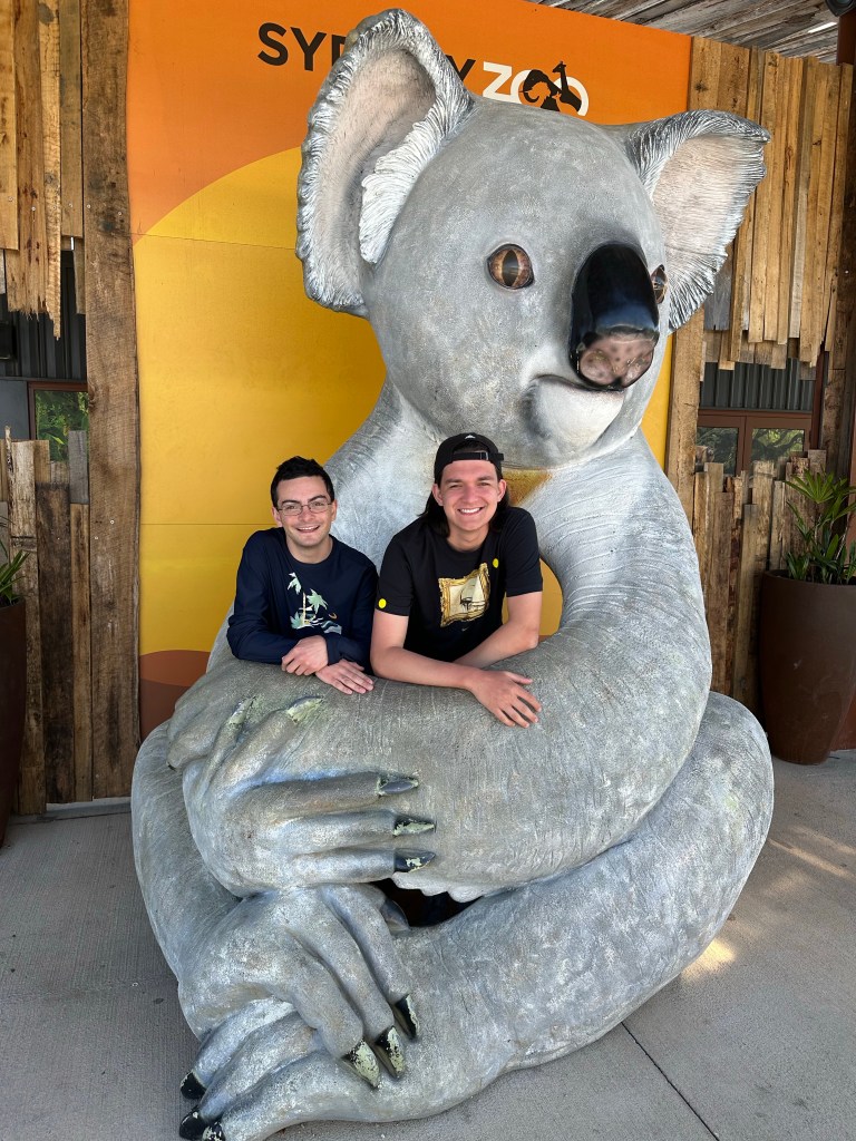 David and Owen being hugged by a Koala
