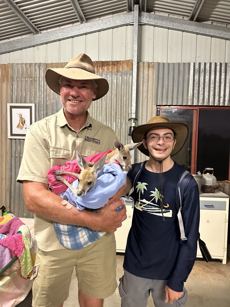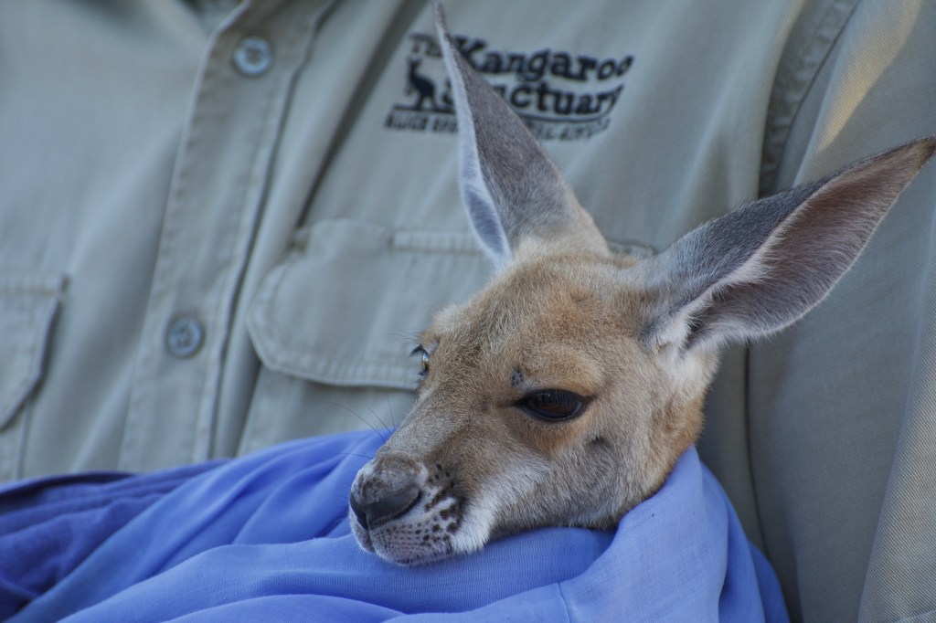 The Kangaroo Sanctuary is a run by a man named Chris who actually was on National Geographic BBC for a while in Kangaroo Dundee. There are a lot of Kangaroos that get killed by cars because they hop out to the side of the road to eat (often more vegetation because the ground is watered by water particles in exhaust from cars. Often the joeys in the mother’s pouch survive the crash due to the pouch’s protective muscles. Whenever Chris sees a dead Kangaroo, he checks the pouch and if there is a baby in it, he’ll take it out and raise it himself.