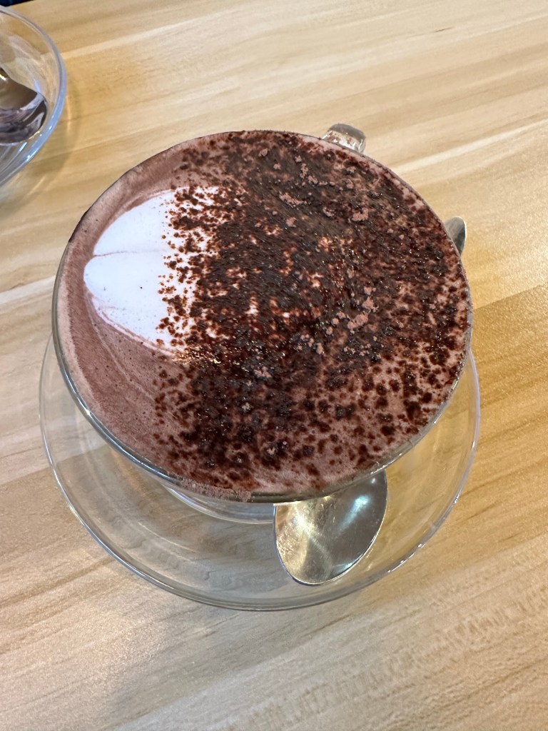 The weather was pretty cold and rainy at this point but that didn’t stop us, we next headed over to Oriental Bay to see the beach. Then it started raining hard and that did stop us. So, we ran inside the boat café (I went here back in my first week!) and Elena got a coffee and I got a hot chocolate. We walked back to her hostel and I headed off to New World to do some shopping. It was a fun day.